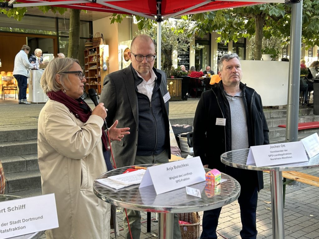 All diese Themen haben wir im Rahmen eines Aktionstags „Besser wohnen in Dortmund“ in Hombruch thematisiert. Am Rande des Wochenmarkts informierten wir in der Fußgängerzone Harkortstraße über die wohnungsbaupolitischen Ziele der SPD. Im Mittelpunkt stand ein Talk mit unserem Fraktionsvorsitzenden im Landtag Jochen Ott, Bürgermeister Norbert Schilff, dem Geschäftsführer des Mietervereins Dortmund Dr. Tobias Scholz und dem geschäftsführenden Vorstand der Gemeinnützigen Baugenossenschaft Lütgendortmund Ingo Müller.