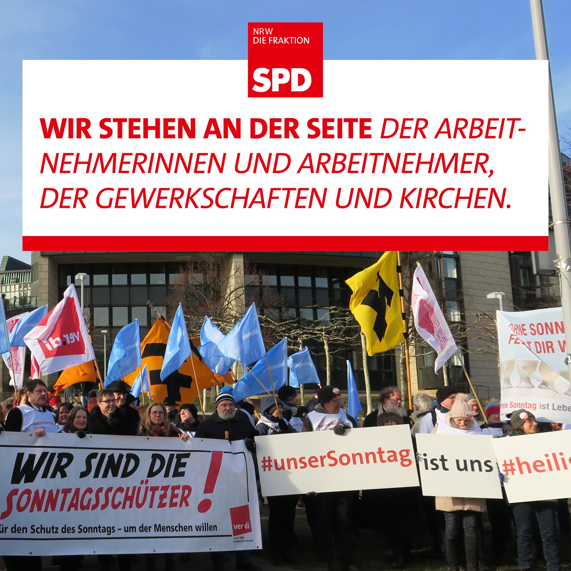 „Die Scheinheiligkeit der CDU ist nicht zu überbieten. Während Ministerpräsident Armin Laschet (CDU) die christlichen Werte als das alles zusammenhaltende Moment der CDU in Sonntagsreden bemüht, schränkt die CDU im Landtag NRW zusammen mit der FDP die Sonntagsruhe weiter ein. Die Mitte-Rechts-Koalition aus CDU und FDP hat gegen den Protest der Kirchen eine Ausweitung von bislang vier auf nunmehr acht Sonntage im Jahr ermöglicht.