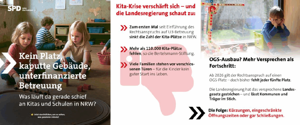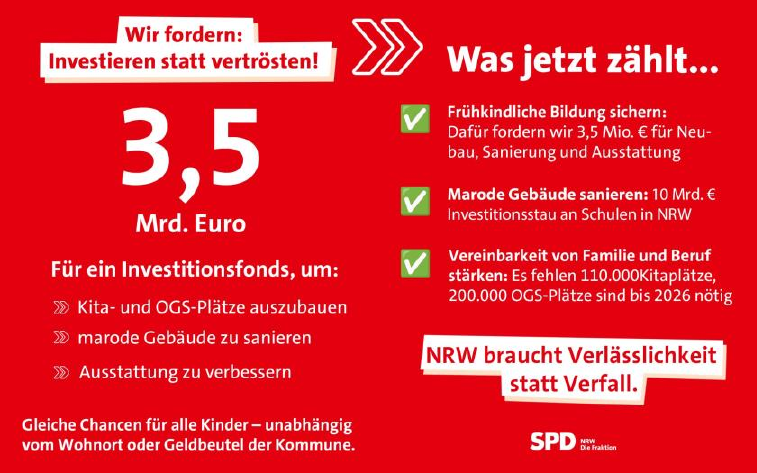 ▪ Antrag „NRW muss funktionieren. Kita- und OGS-Plätze ausbauen, marode Gebäude sanie-ren – NRW braucht einen Investitions- und Ausbaufonds für Kitas und Schulen“: