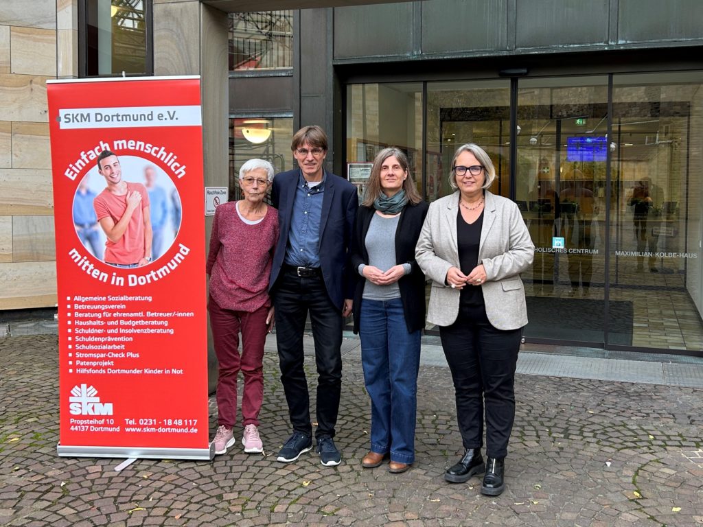 Auf dem Foto abgebildet, v.l.n.r.: Margarete Konieczny, Vorstandsmitglied SKM Dortmund, Alwin Buddenkotte, Geschäftsführer SKM Dortmund, Susanne Riediger, Leiterin der Fachstelle Ausgleich Westfalen-Ruhr, Anja Butschkau, Landtagsabgeordnete (SPD).