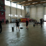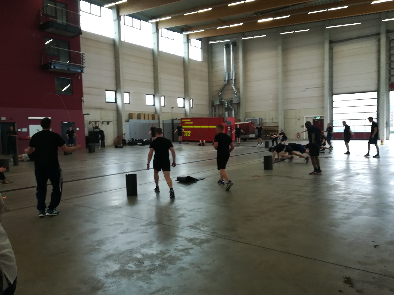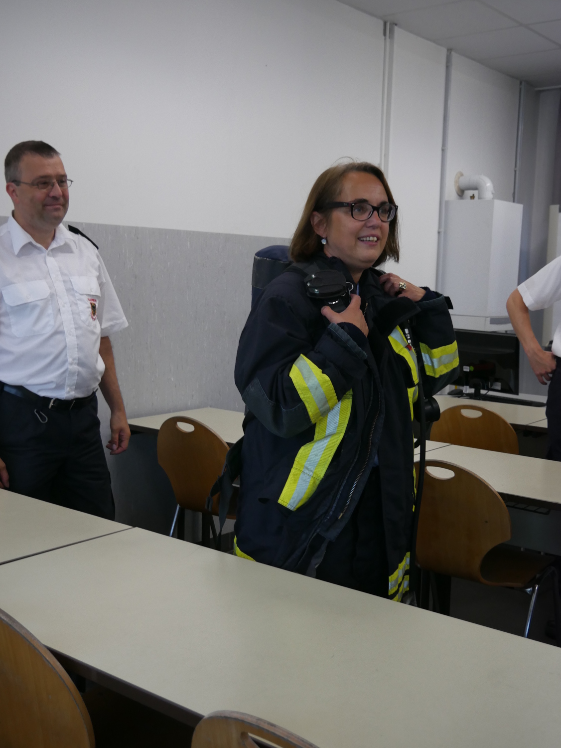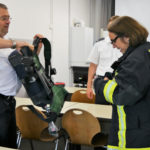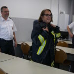 Wir gewannen auch Einblicke in den praktischen Alltag des Ausbildungszentrums: der Sportunterricht der Grundausbildungslehrgänge und der praktische Unterricht an der Rettungsdienstschule. Im dreigeschossigen Brandhaus, dem Ort, an dem unter realen Bedingungen zum Beispiel „Feuer aus machen“ geübt wird, bekamen wir einen guten Einblick in die Extremsituationen, die Feuerwehrleute in ihrem Alltag erleben. Für uns wurde ein Deckenbrand simuliert. Hierbei mussten wir tief in die Hocke gehen, um der extremen Hitze zu entgehen. Ich zog mir dort auch noch eine Schutzausrüstung für Feuerwehrleute an – Respekt, die sind ordentlich schwer.