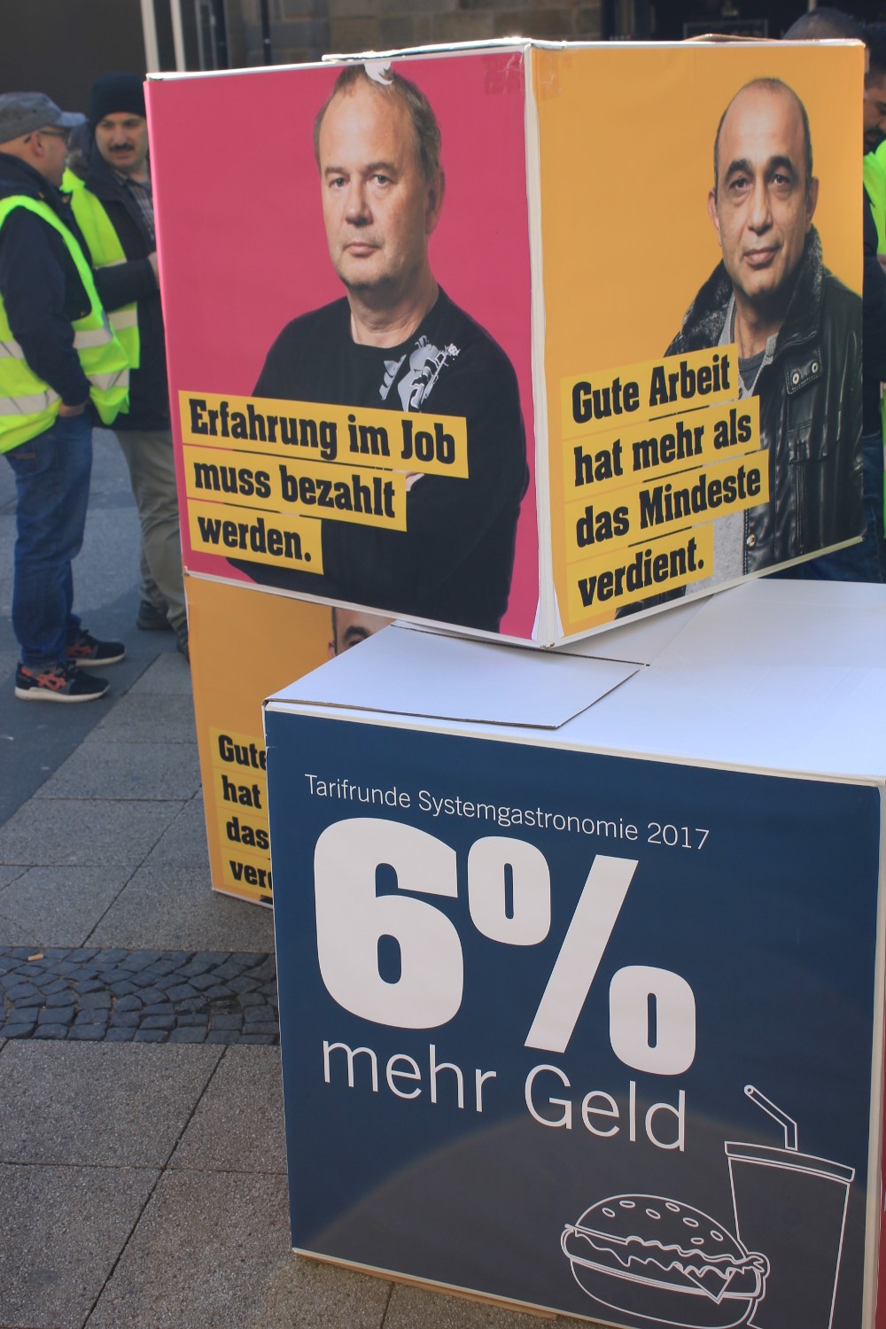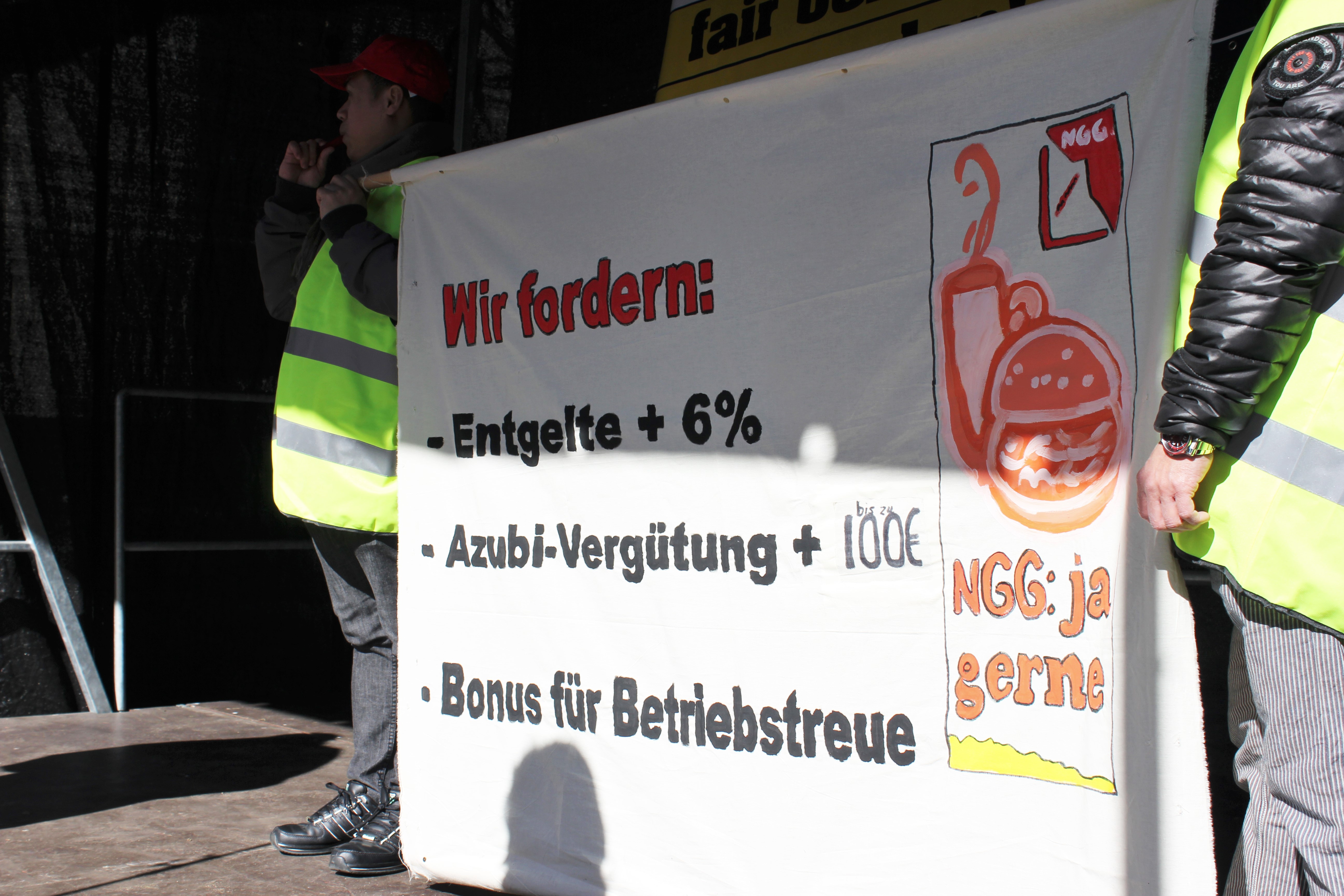 Seit Oktober 2016 verhandeln die NGG und der Bundesverband der Systemgastronomie (BdS) über einen neuen Tarifvertrag für die rund 100.000 Beschäftigten, die bei McDonald’s, Burger King, Starbucks, Vapiano etc. arbeiten. Nachdem auch in der dritten Tarifrunde keine Einigung erzielt werden konnte, hat die NGG den Druck auf die Arbeitgeber erhöht und zu Warnstreiks aufgerufen.