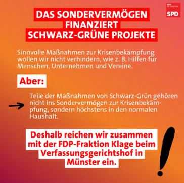 Deshalb klagen wir jetzt gegen das Gesetz zum Sondervermögen Ukraine, die Kreditermächti gung von fünf Milliarden Euro sowie die Kreditaufnahme im Corona-Sondervermögen in Höhe von rund vier Milliarden Euro im Herbst 2022. Für einen transparenten, ehrlichen und verfassungskonformen Landeshaushalt.