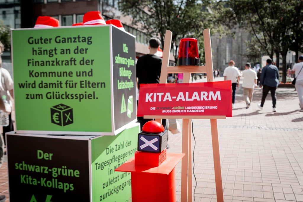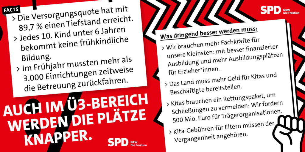 Doch es fehlt nicht nur an Betreuungsplätzen: Unsere Kitas sind dramatisch unterfinanziert und nicht selten von Insolvenz bedroht. Doch die schwarz-grüne Landesregierung weigert sich die Tarifkostensteigerungen in Höhe von 500 Millionen Euro auszugleichen. Außerdem fehlen in NRW bis 2030 bis zu 20.000 Kita-Fachkräfte. Schon im Frühjahr 2024 mussten deshalb mehr als 3.000 Kitas ihre Angebote einschränken oder komplett schließen. Leidtragende sind Mitarbeitende, Eltern und Kinder, die auf einen erreichbaren Kita-Platz, verlässliche Öffnungszeiten und gute Arbeits- und Lernbedingungen in der frühkindlichen Bildung angewiesen sind.